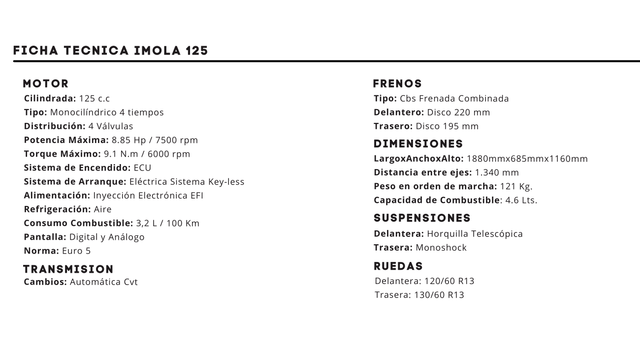 ESTILO DEPORTIVO Y DISEÑO ITALIANO QUE SE REFLEJA A SIMPLE VISTA AL ANDAR. DISEÑO INNOVADOR Y DISPONIBLE EN VARIOS COLORES, IMOLA 125 ES EL ESTILO URBANO A ELEGIR. PRESTACIONES INNOVADORAS Y ECONOMIA AL ANDAR LA MEJOR OPCION EN EL MERCADO. CERTIFICACION EURO 5 PARA MENORES EMISIONES.